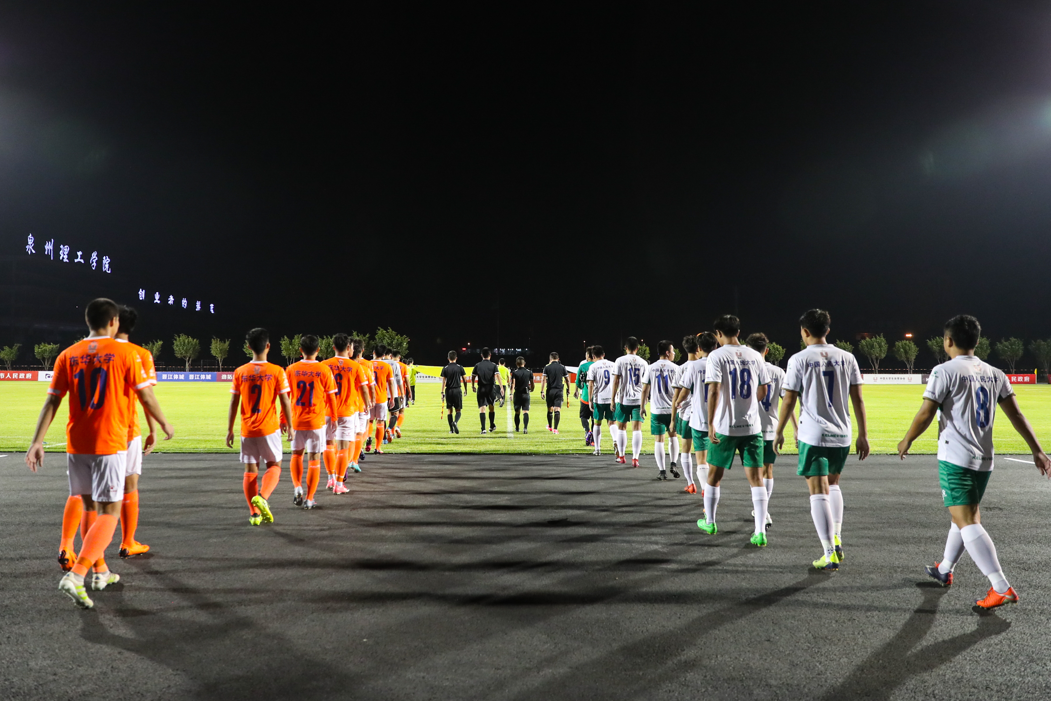 8月19日晚,在福建晋江举办的2018年亚洲大体联亚洲杯中国大学生足球选拔赛男子组比赛进入第二轮,东华大学队对阵中国人民大学队,最终东华大学4:2战胜中国人民大学。 东华大学男足身着橘黄色球服,中国人民...