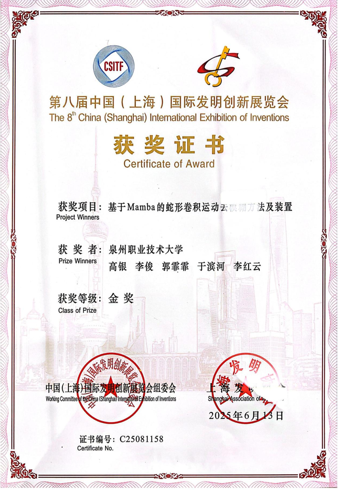近日,第八届中国(上海)国际发明创新展览会在上海世博展览馆落幕。本届展会以"创新驱动发展"为主题,汇聚来自全国及印尼、俄罗斯等国的800余项尖端科技成果,展会设立创新发明展区、未来发明家展区和境外创新发明展区三大板块,为全球科技创新成果提供高水平的国际展示与交流平台。泉州职业技术大学携先进发明成果在展览会中脱颖而出并斩获金奖。本次荣获金奖项目为“基于Mamba的蛇形卷积运动去模糊方法及装置”,该项目是我...