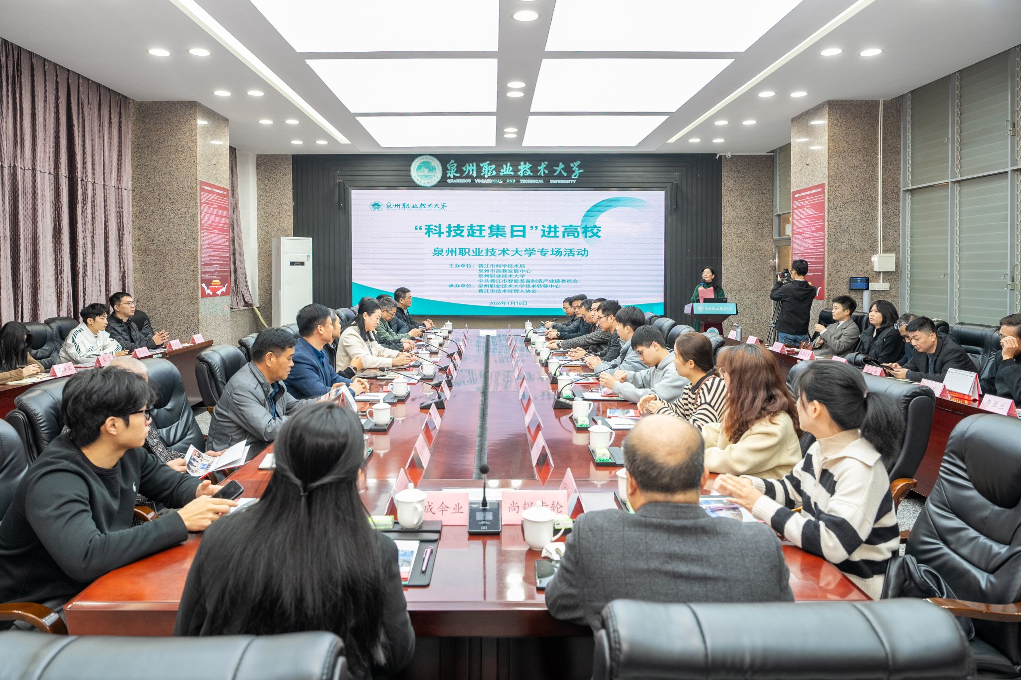 1月16日,“科技赶集日”高校专场活动在泉州职业技术大学举行。活动由晋江市科学技术局、泉州市高教发展中心、泉州职业技术大学、中共晋江市智能装备制造产业链委员会联合主办,泉州职业技术大学技术转移中心、晋江市技术经理人协会共同承办。▲ 我校科研处处长任莉娟主持活动泉州职业技术大学副校长张建军在致辞中表示,学校始终秉持产教融合理念,与区域产业协同发展。未来,我校将携手各方,找准科技合作的需求点,找准协同...