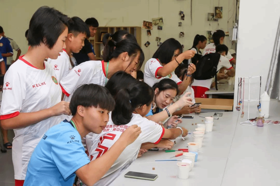 自制足球徽章和精美的小饰品,这是文创工坊带给我们的特殊体验,球员们都积极地投入制作当中,期待着能做出那个独一无二的纪念品。