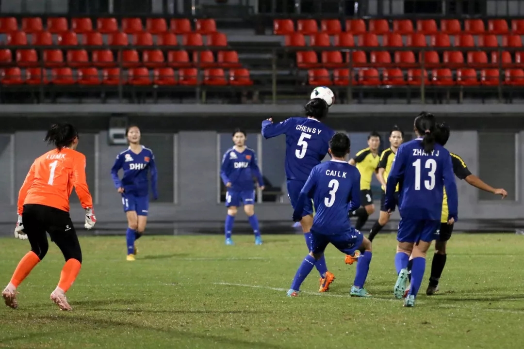 第5分钟,东华大学队16号球员尤丹丹带球走中路,在弧顶附近起脚远射,皮球打在对方球门横梁下沿后入网。东华大学队1:0,暂时领先。