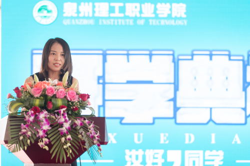 毕业生、泉州石邦传媒有限公司创办人、总经理李佳玲作为校友代表发言,讲述了自己对母校的感恩之情,分享了毕业后的创业历程,希望同学们学会尊重,坚守诚信,学会感恩,不负理工行。