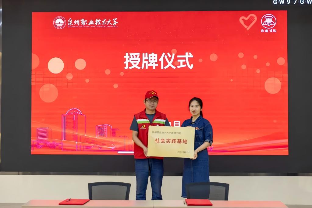 ❖ 泉州职业技术大学拾德书院党总支书记王秋玲为基地颁发牌匾,晋江青年志愿者协会旭日服务队队长黄朝阳上台代表团队接受牌匾