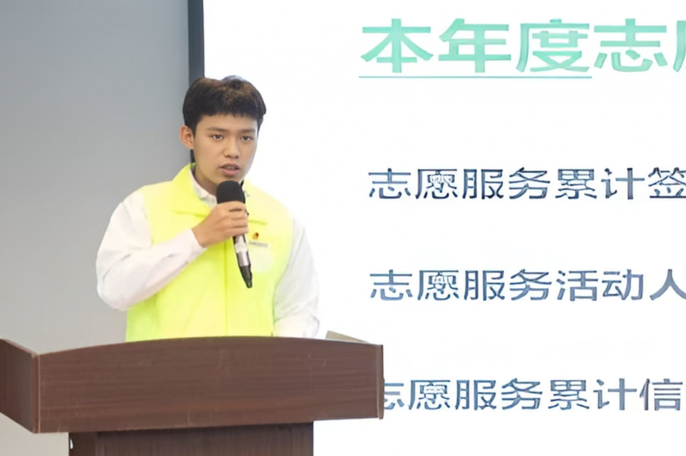 优秀志愿者代表沈文从成为一名志愿者的契机及志愿服务经历展开描述,表达了志愿服务经历对自身产生的积极影响,表示自己作为青年一辈将不断秉承“奉献、友爱、互助、进步”的志愿精神,积极参与志愿活动,奉献青春力量。