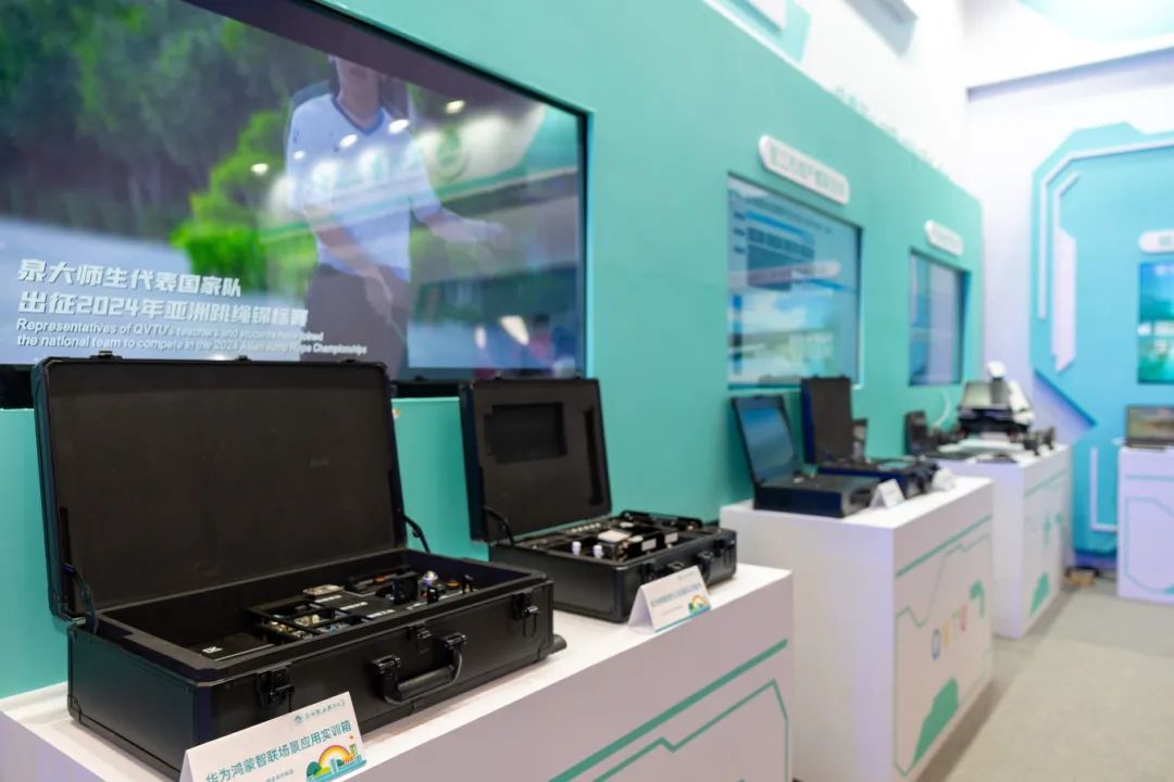 同时,展区内联合创新产业学院展示了基于华为昇腾、鲲鹏、鸿蒙三大基座的新一代信息技术专群教学改革和人工智能教学实训设备,其中,鸿蒙开发、AI训练、智能家居、L3级自动驾驶等实训项目受到与会嘉宾的高度关注。