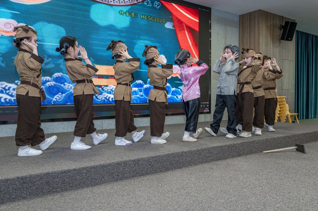 “天乌乌/欲落雨/阿公啊拿锄头/欲掘芋……”演出开始时,由中班、大班小朋友合作共同带来闽南童谣舞蹈《天黑黑》。伴随着音乐声响起,只见,孩子们穿戴着褐色的古装服饰,一会学着童谣里的老公公比划锄地的动作,一会又模仿老公公抓泥鳅的场景,表演得生动又俏皮。