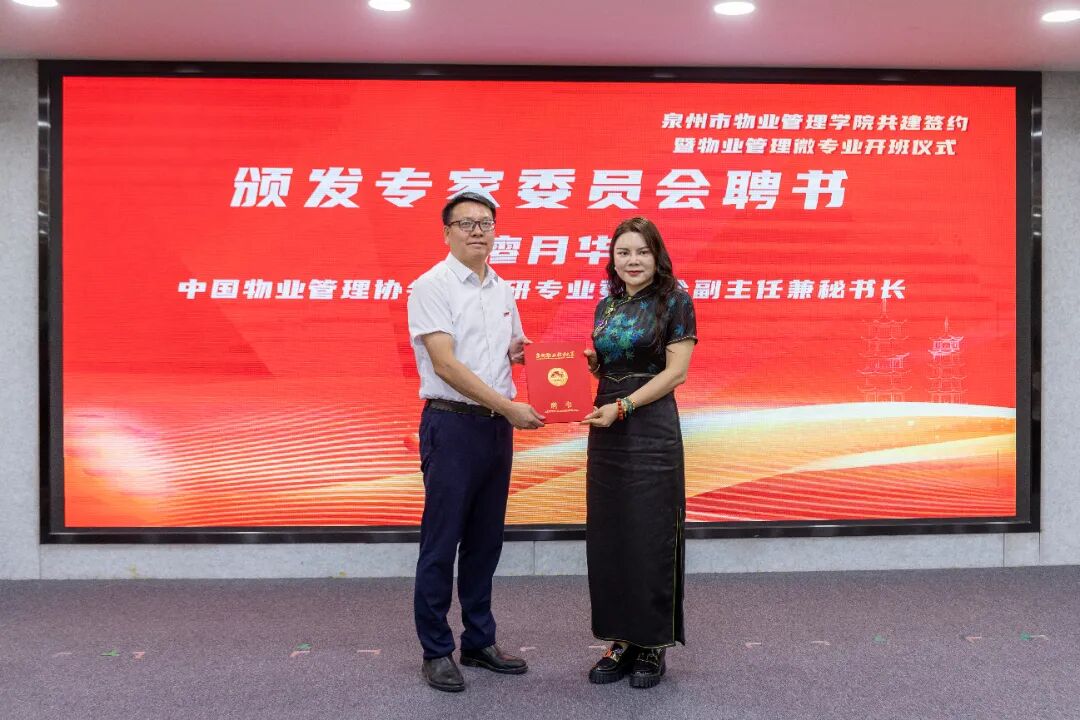 泉州职业技术大学副校长林文艺为首批专家委员会成员颁发聘书,他们分别是中国物业管理协会产学研专业委员会副主任兼秘书长廖月华,西安欧亚学院物业研究院副院长薛雯、厦门市物业管理协会会长黄嘉辉,福建省物业管理协会副会长、厦门市物业管理协会副会长王丽水,泉州市物业管理协会会长郭志铭,晋江市物业管理协会会长黄志强,泉州市洛江区物业管理行业协会会长庄曦,福建省物业管理专家、泉州市住建局物业管理专家黄永发,骏源(福建)生活服务发展有限公司董事长林振彬,福建省长冠物业管理有限公司董事长庄能辉,福州融侨物业管理有限公司执行总经理万星星,福建省晋江市建设投资控股集团有限公司副总经理、福建省晋江新佳园控股有限公司董事长、晋江市新佳园物业发展有限公司董事长李德毅。