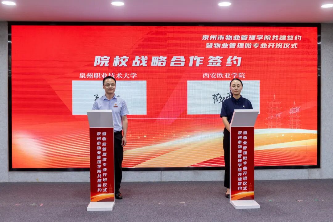 院校战略合作签约西安欧亚学院物业研究院副院长薛雯与泉州职业技术大学人居环境学院书记张艺能签署战略合作协议。
