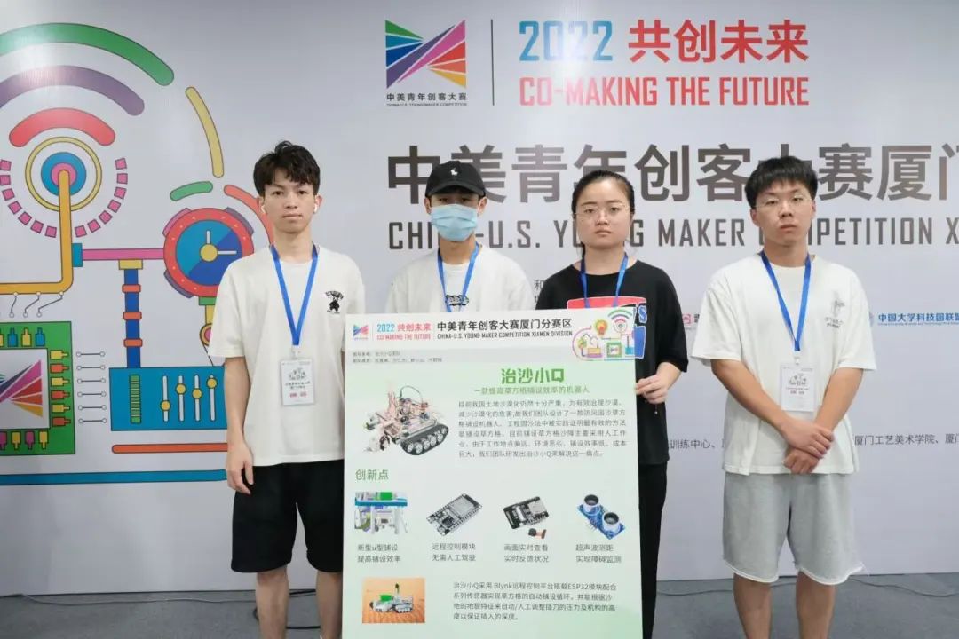▲ 叶蔚锴(左二)参加2022共创未来中美青年创客大赛,他与团队共同制作的“治沙小Q智能机器人”获一等奖