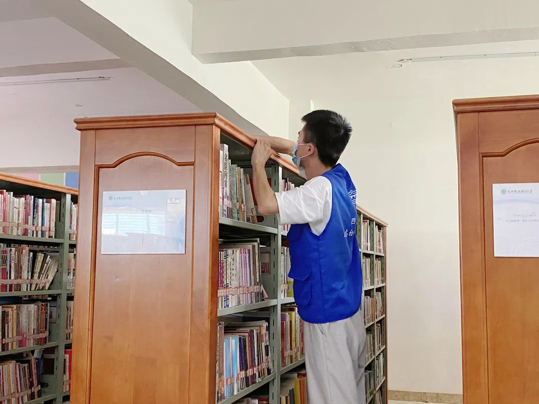 在图书馆内,化身为“小蓝人”的志愿者们,不怕辛苦,仔细地擦拭每一摞图书。
