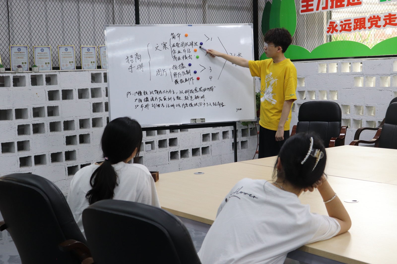 在会上,公司总经理洪良彬表示,为进一步实施乡村振兴战略,营造浓厚社会氛围,福建省晋航农业股份有限公司决定围绕乡村振兴发展为乡村共享驿站制作宣传手册。他提出,在制作宣传册时封面要美观大方,在排版上要合理规划布局,可以通过线条、颜色搭配合理表现,从而让版面变得具有科技感,同时要注重细节,强化乡村共享驿站宣传力度,从而更好地服务于乡村共享驿站的建设。随后,实践团成员在洪良彬的介绍下,学习了乡村共享驿站运营模式等相关知识。