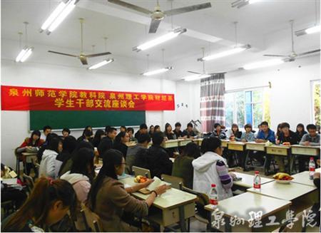 名学生干部前往泉州师范学院,与教科院学生会、自律会成员一起召开了一次学生干部经验交流座谈会。泉理工财经系党支部书记陈荣惠、团总支书记王园园、辅导员贺建文以及泉州师院教科院办公室主任魏国钦、团委老师陈欣出席座谈会。