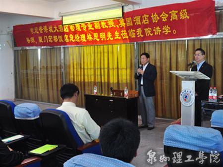 10月 26日下午两点,香港城大酒店管理专业副教授、美国酒店协会高级导师林思明先生到我校进行了长达一个半小时的精彩演讲。商贸系 10级和11级旅游管理及酒店管理的全体同学参与此次活动。